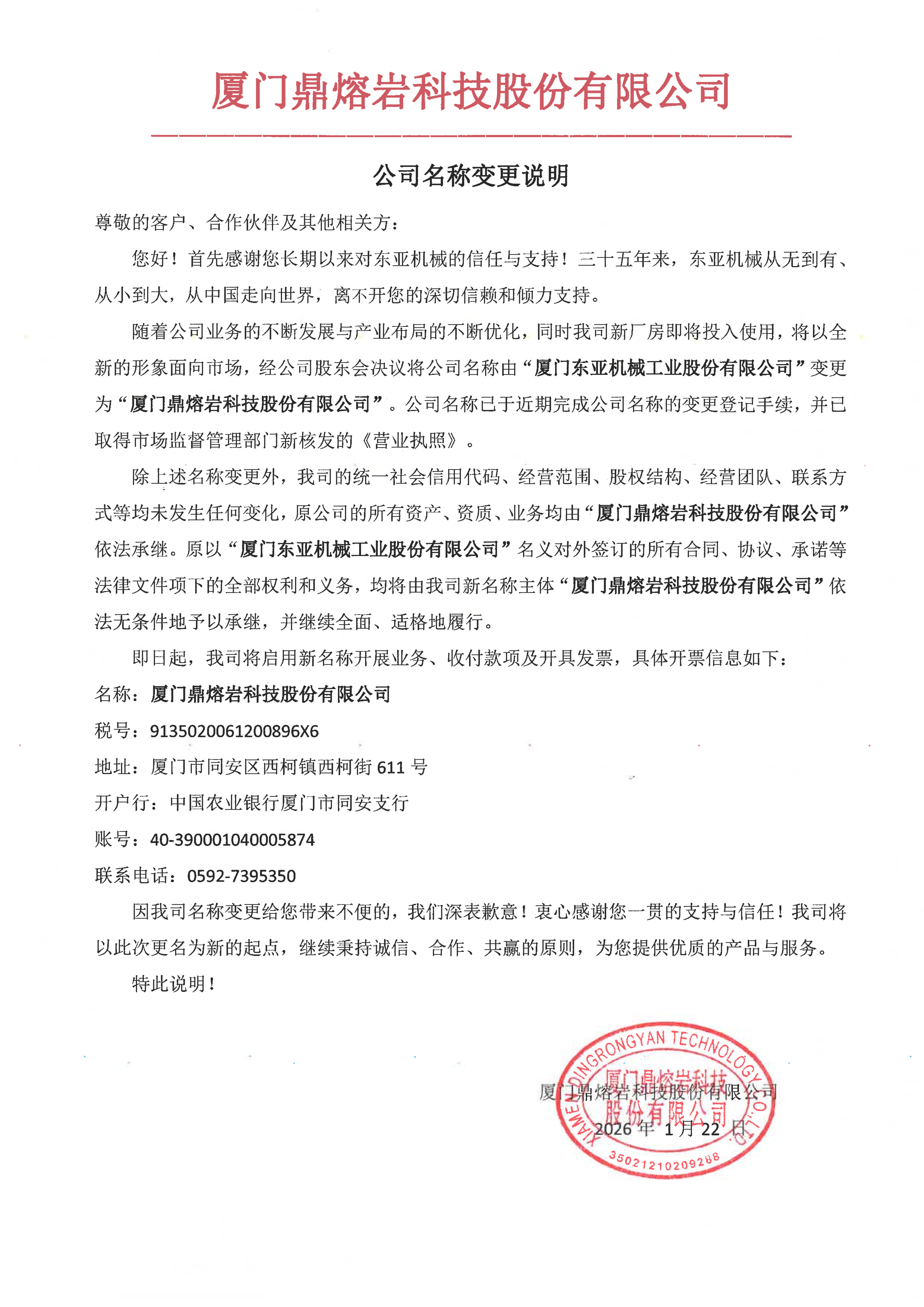 关于“东亚机械”更名为“新利体育”的名称变更说明