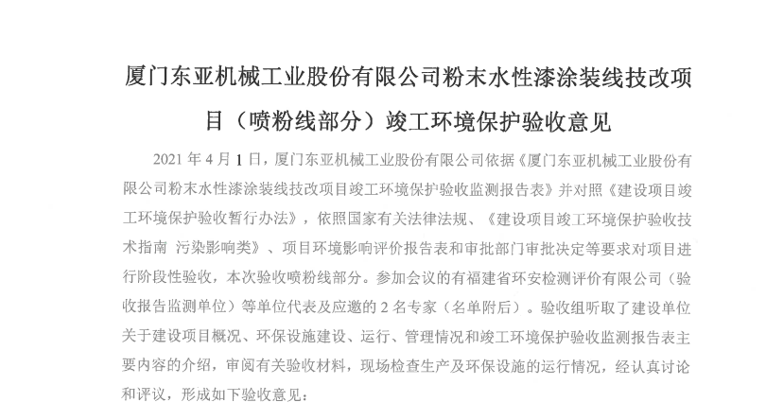 厦门东亚机械工业股份有限公司粉末水性涂装线技术改造项目(喷粉线部分)竣工环境验收意见